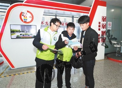 昆山交發(fā)集團(tuán)積極推進(jìn)服務(wù)型黨組織建設(shè),近日,首個(gè)黨員志愿服務(wù)站點(diǎn)“壘壘驛站”在軌道交通11號線花橋段兆豐路站成立。由黨員志愿者和入黨積極分子組成的“壘壘使者”在驛站為乘客和市民提供黨建宣傳、城市文化宣傳以及咨詢、志愿幫扶等服務(wù),擦亮江蘇東大門的窗口形象。圖為昨天“壘壘使者”為乘客提供交通換乘咨詢服務(wù)。來源:昆山日報(bào) (A1) 記者:周舟 攝