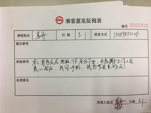 據(jù)了解,當(dāng)天中午一點多的時候,乘客李女士不小心將背包遺失在列車座位下面,站臺下行站務(wù)員進行清客時發(fā)現(xiàn)遺留的背包并通知值班站長,值班站長隨即派工作人員將背包拿至站長室,與客運值班員共同清點包內(nèi)物品并且做好登記,在發(fā)現(xiàn)有乘客報失后立即與其取得聯(lián)系并通知其前來認(rèn)領(lǐng)。李女士拿到遺失物品后對此表示十分感謝,并寫下了感謝信。
