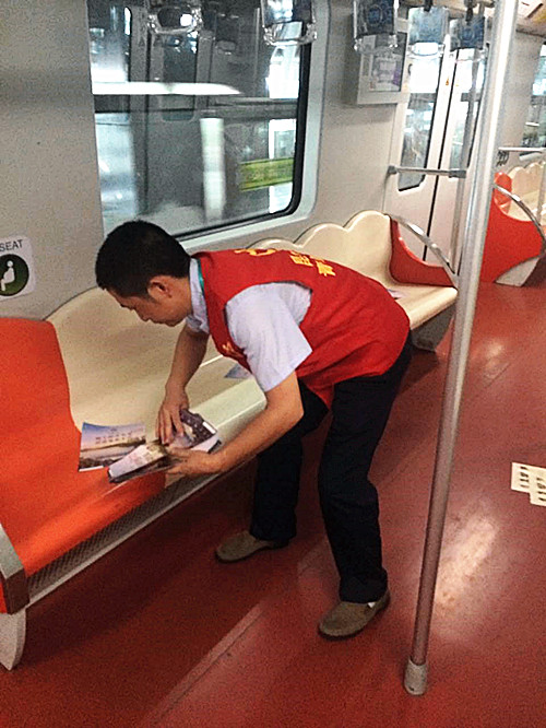 為鞏固文明城市創(chuàng)建階段性成果,同時(shí)針對(duì)近期出現(xiàn)車廂小廣告散發(fā)不整潔現(xiàn)象。從2017年7月10日起,軌道公司組織志愿者及物業(yè)保潔人員開(kāi)展“你貼我撕、你發(fā)我撿”專項(xiàng)清潔行動(dòng),對(duì)地鐵車廂進(jìn)行監(jiān)督巡查。
