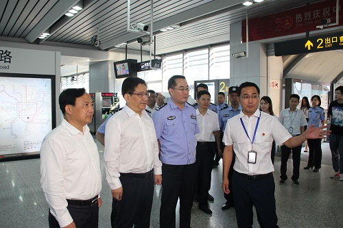 9月26日下午,蘇州市委常委、政法委書記徐美健帶隊督導(dǎo)檢查軌道公司兆豐路站新中國成立70周年大慶安保維穩(wěn)工作,市領(lǐng)導(dǎo)張月林、魏杰陪同視察。