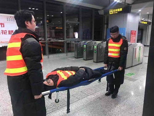 演練模擬了車站節(jié)假日期間突發(fā)大客流,自動扶梯上乘客擁擠,導致多人摔倒受傷。當此事件發(fā)生后,站務員迅速趕至自動扶梯旁關停扶梯,查看傷員情況,并立即匯報車控室及值班站長,值班站長立刻通知各崗位啟動群死群傷應急處置預案,行車值班員通過車站廣播提醒乘客不要擁擠,注意安全;客運值班員拿著醫(yī)藥箱趕至現場,幫助乘客處理傷口;站務員將受傷嚴重的乘客抬上擔架前往出入口,等待120救護車。在值班站長的指揮下,車站全體員工各司其職,相互配合,維護現場秩序,保障運營安全。
