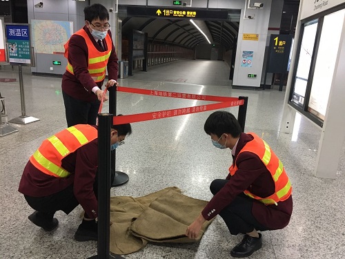 演練模擬運(yùn)營(yíng)期間軌道交通11號(hào)線兆豐路冰凍天氣導(dǎo)致車站水管凍裂漏水,站務(wù)員看到后立即匯報(bào)車控室,車站值班站長(zhǎng)抵達(dá)現(xiàn)場(chǎng)后,通知各崗位車站啟動(dòng)冰凍災(zāi)害應(yīng)急處置預(yù)案,值班站長(zhǎng)立即至漏水點(diǎn)處進(jìn)行應(yīng)急處置,做好積水區(qū)域安全隔離工作。行車值班員利用廣播做好乘客信息告知工作,聯(lián)系相關(guān)搶修部門。客運(yùn)值班員做好專業(yè)搶險(xiǎn)搶修隊(duì)伍接應(yīng)引導(dǎo)工作??头藛T做好乘客宣傳解釋工作。站務(wù)員聽(tīng)從值班站長(zhǎng)安排關(guān)閉相關(guān)閥門、水泵。