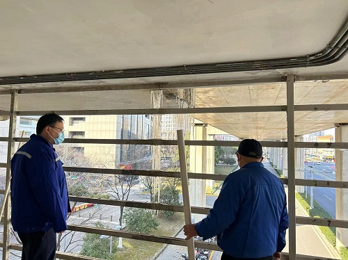 本次工作由維??乒ぐ嘭撠?,協(xié)同委外展開除冰工作。在做好安全防護工作后,工班及委外人員在西端消防通道外確定冰錐位置,讓下方人員擺放警示樁桶,并對過往行人車輛進行安全指引。確認后進行除冰工作,施工人員用桿子先將容易清除的冰錐打落,然后將大塊冰錐下端敲掉,再將冰錐底部敲松,最終完成本次除冰工作。